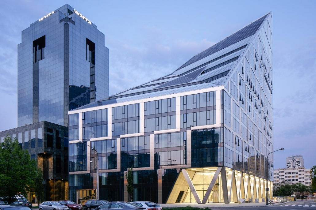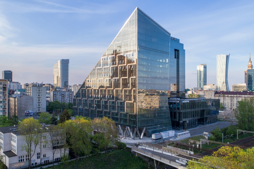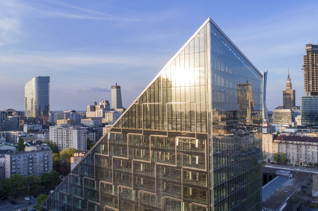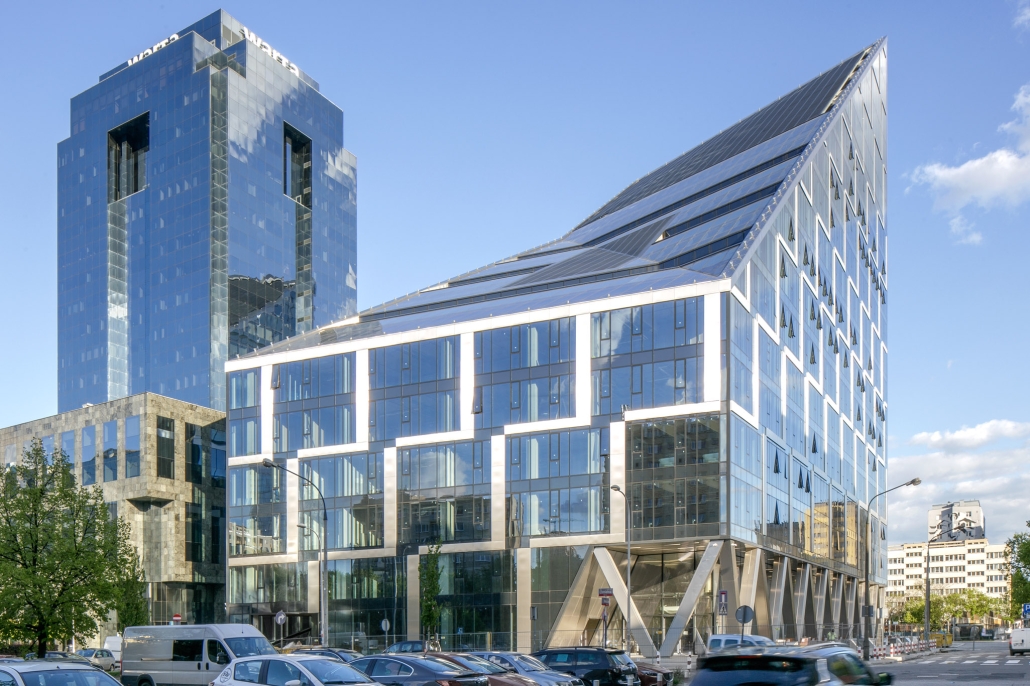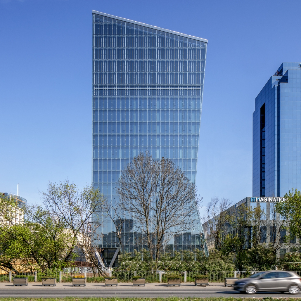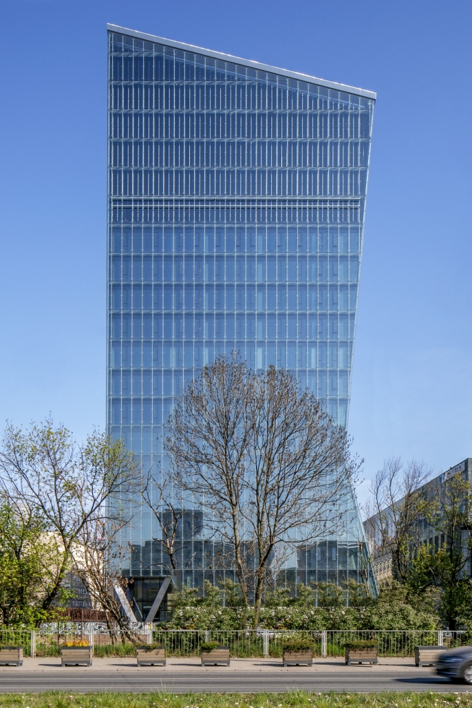 “Chmielna 89 – an office building with a characteristic acute angle shape, resembling a crystal – with its eastern façade having a negative angle of inclination, its façade elements giving the impression of regular rectangles being in fact parallelograms, surprised even the designers themselves”
