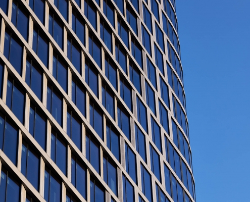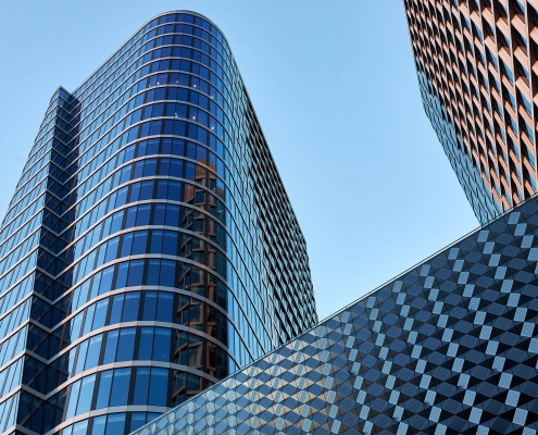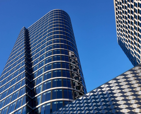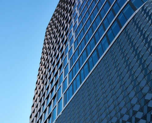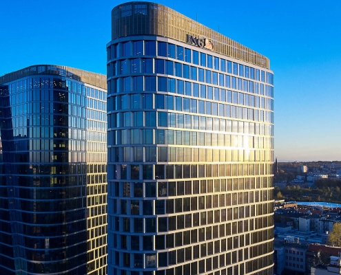 The structure is distinguished by a technically sophisticated segment-based façade. The building complex has, among others glass mullion-transom façades and a façade made of 3D panels. Preparing the façade of the towers required the installation of modules of a given storey from the inside of the building – embed on specially prepared lower and upper profiles. The structure also includes invisible transitions from the infill façade to the curtain façade achieved thanks to special transition modules and frames. One of the unique features of the towers are also the characteristic slants in the glass façade.