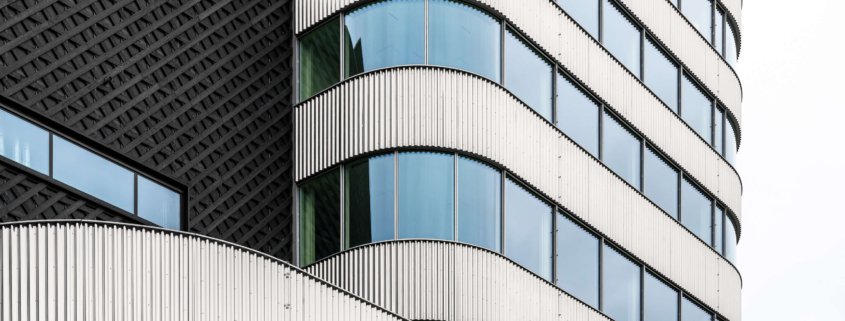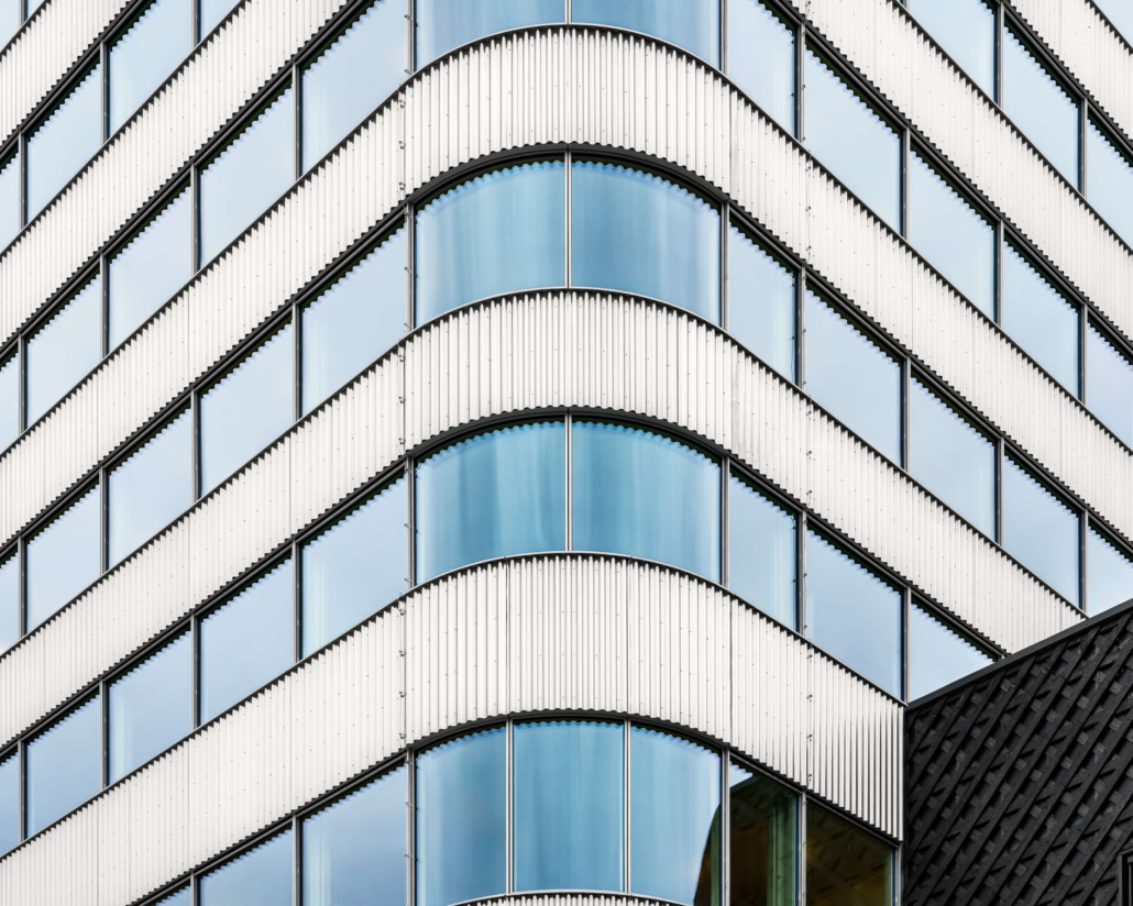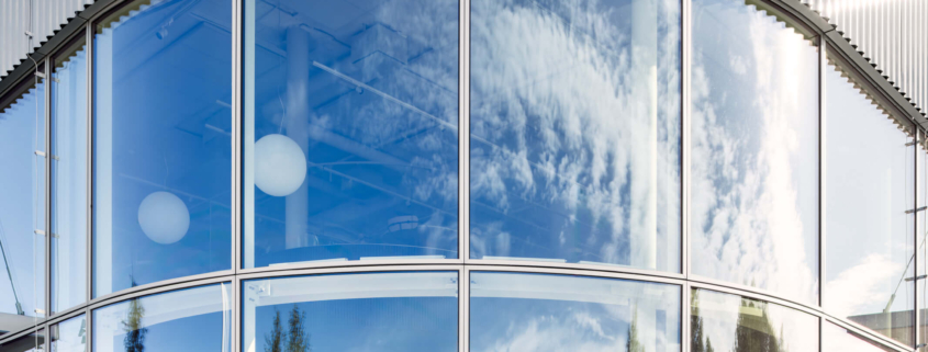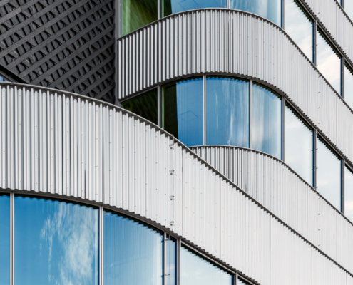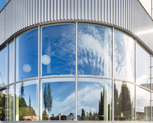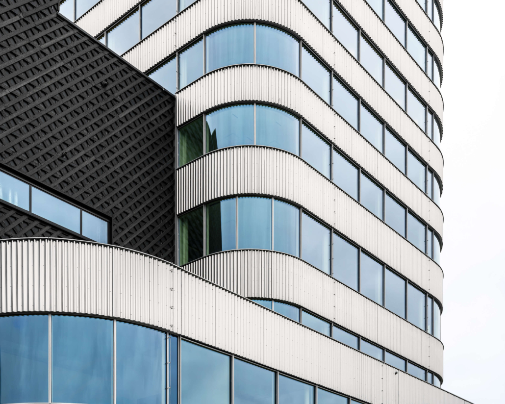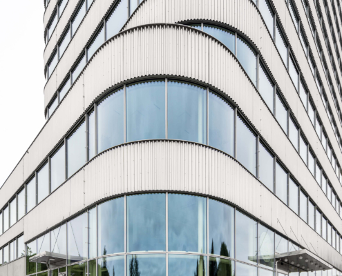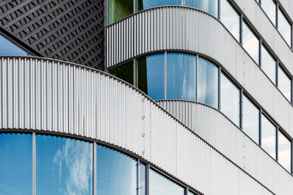 The unique façade with stainless steel elements covers approx. 3,500 m² of glass supplied by PRESS GLASS, of which approx. 500 m² of curved glass (cylindrical and 3D), confirming the versatility of this technology in such modern and innovative projects. Most of the glazing has been tested using Heat Soak Test.